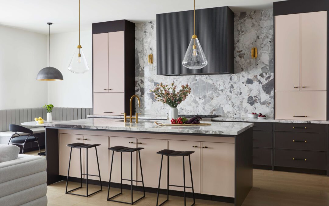 The kitchen serves as the statement piece of the home—highlighted by custom millwork in charcoal and blush matte lacquer, full-height marble surfaces with rich veining, and refined black and brass hardware. A built-in breakfast nook, custom pantry, walkthrough servery, and fully integrated appliances enhance both form and function.